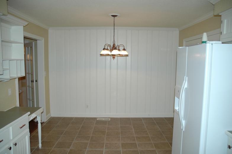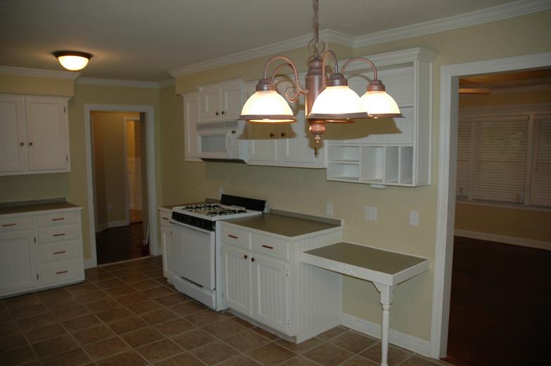 This spacious eat in kitchen has a new tile floor, updated cabinets, and a gas stove. French doors lead out to the fenced back yard.
