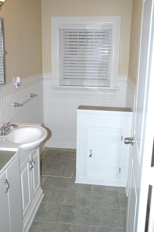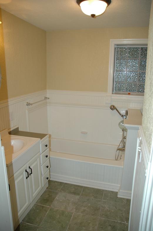 The bathroom on the left is located between 2 bedrooms and has a full shower. The bathroom on the right is adjacent to the largest bedroom and has a washer/dryer.