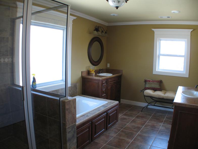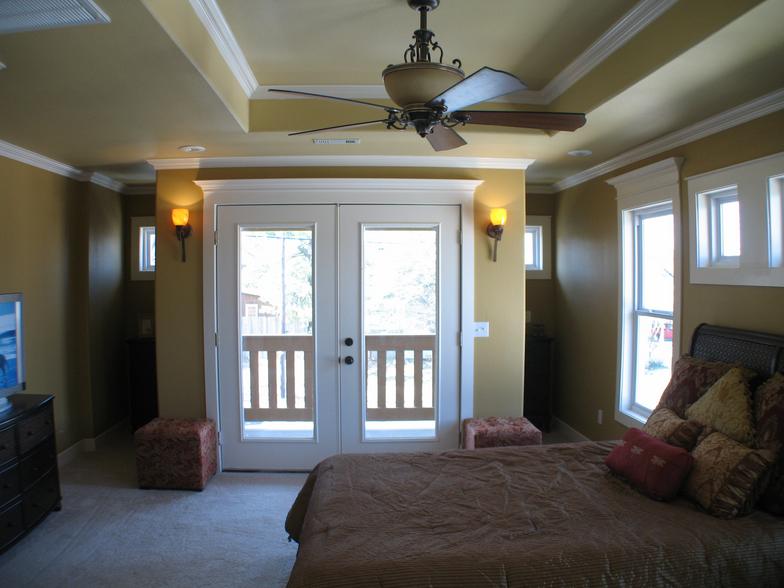 Upstairs master suite - bathroom features dual vanities, separate shower and tub, and walk-in closet. Amenities in the bedroom include a tray ceiling, private balcony, and linen closet.