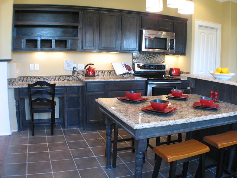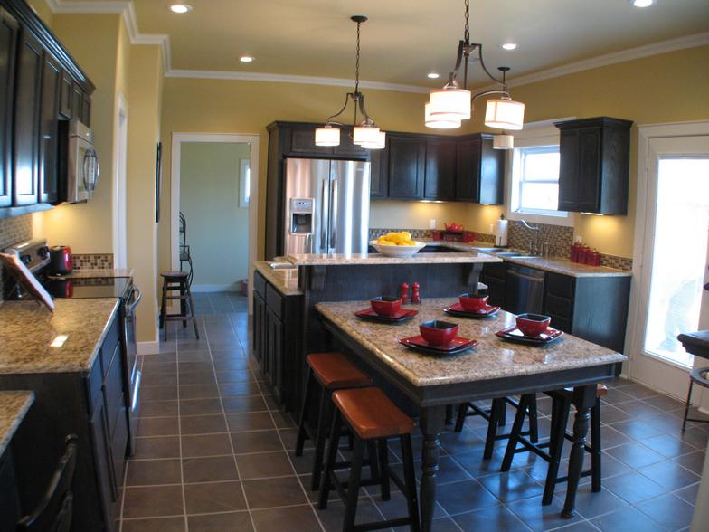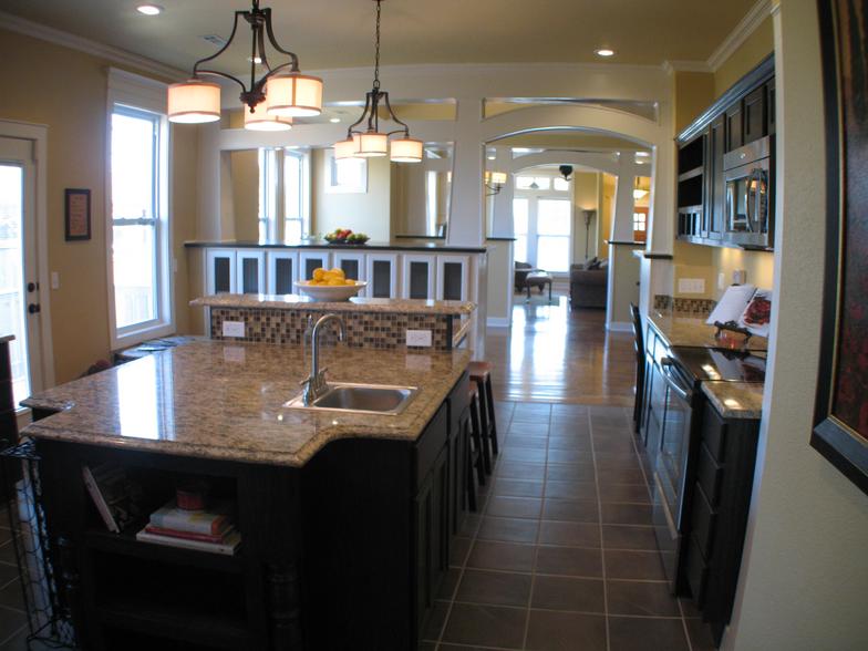Large, eat-in kitchen, with unique custom designed island, granite countertops, and stainless appliances.